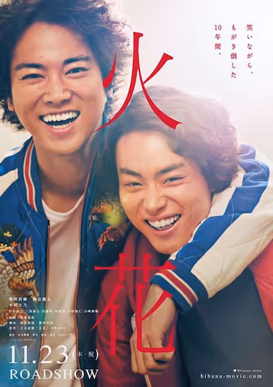 Sparks是一对完全不卖座的青年卖座组合,在某次露天演出中,成员之一德永(菅田将晖 饰)被傻瓜二人组的神谷才藏(桐谷健太 饰)所吸引。神谷同样渴望成名,他空有满脑子的好点子,却始终和这个世界格格不入。德永钦佩对方,于是请求拜对方为师。与之相对,神谷则提出了要德永为他写传记的要求。此后的岁月里,师徒二人惺惺相惜,每次聊天吃饭都夹杂着令人捧腹的插科打诨。在这一过程中,与神谷同居的女子真里(木村文乃 饰)选择成家,出道没多久的后辈名声大噪,一同打拼多年的搭档萌生退意。为了喜欢的事业,德永和神谷都不知不觉奉献着自己的全部人生,只为那花火退去后的星点光辉……